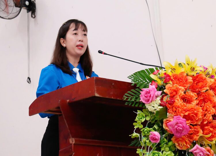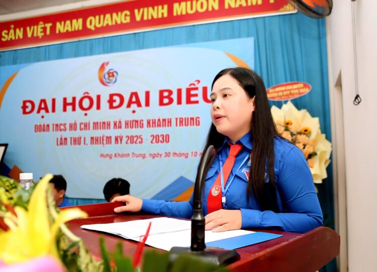 Đồng chí Nguyễn Kim Ngân được chỉ định giữ chức vụ Bí thư Xã đoàn Hưng Khánh Trung, nhiệm kỳ 2025 – 2030 phát biểu tại Đại hội