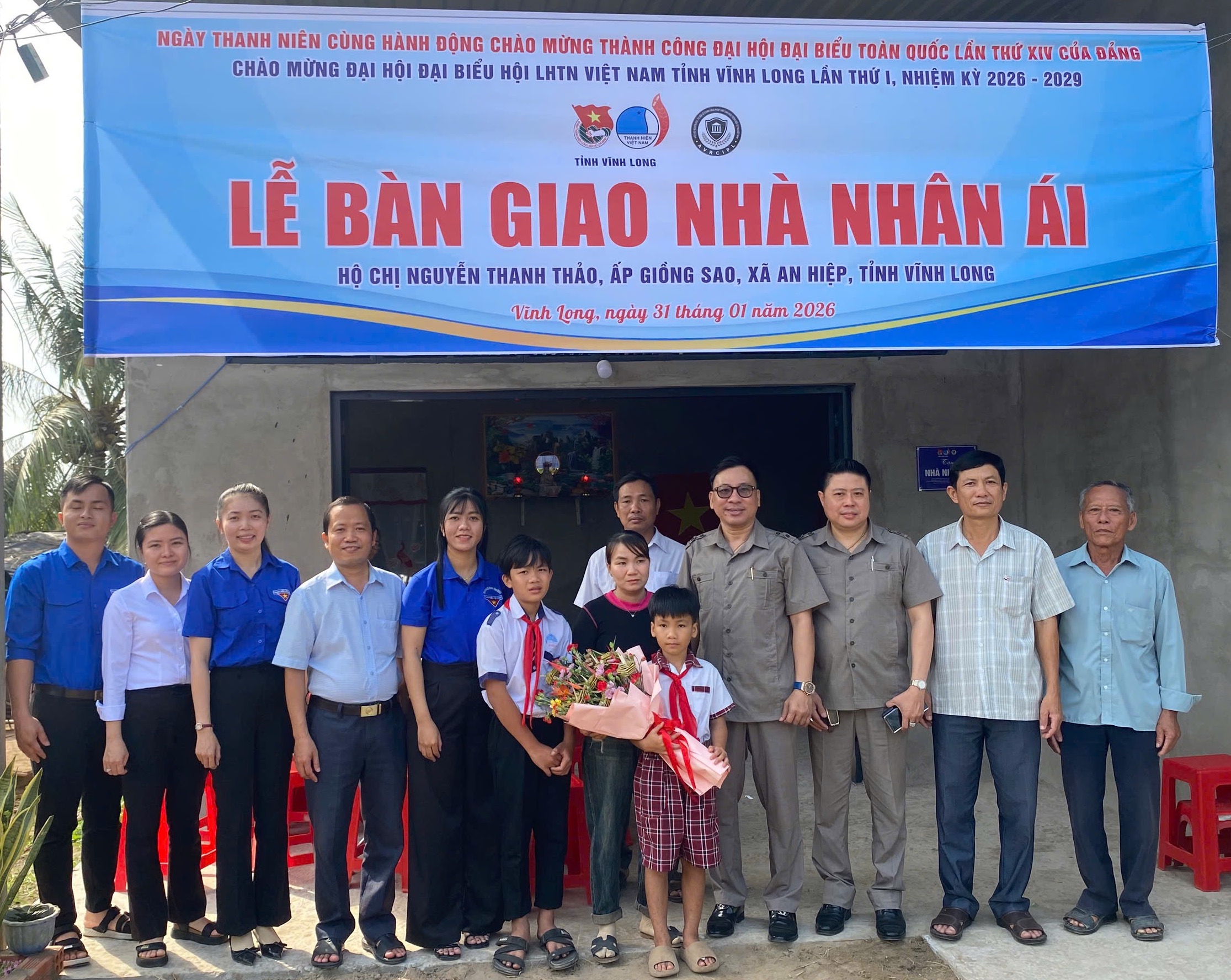 (TVPLO) – Sáng ngày 31/01/2026, Ban Thường vụ Tỉnh đoàn, Ban Thư ký Ủy ban Hội LHTN Việt Nam tỉnh Vĩnh Long đã phối hợp Hiệp hội Làng nghề Việt Nam (VICRAFTS); Viện Nghiên cứu Thị trường – Truyền thông Quốc tế (IMRIC) và Viện Nghiên cứu Chính sách pháp luật&Kinh tế hội nhập (IRLIE) tổ chức Lễ bàn giao công trình Nhà nhân ái cho hộ gia đình chị Nguyễn Thanh Thảo – gia đình có hoàn cảnh khó khăn về nhà ở tại ấp Giồng Sao, xã An Hiệp, tỉnh Vĩnh Long. Công trình chào mừng thành công Đại hội Đại biểu toàn quốc lần thứ XIV của Đảng và chào mừng Đại hội Đại biểu Hội LHTN Việt Nam tỉnh Vĩnh Long lần thứ I, nhiệm kỳ 2026 – 2029.