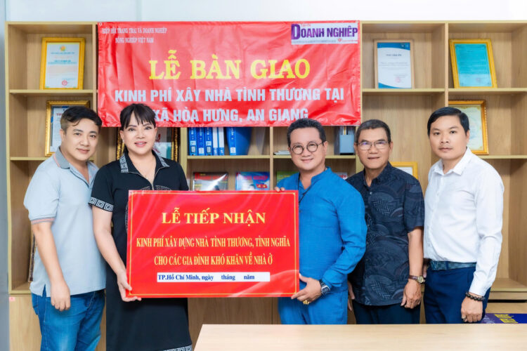 Ts. Hồ Minh Sơn; ông Hồ Phú Quốc Cương – Ban biên tập Tạp chí Doanh nghiệp và Trang trại Việt Nam; Nghệ nhân kim hoàn Quốc gia – Hồ Thị Thanh Hương – Tổng Giám đốc Công ty CP Du lịch Đầu tư BĐS Đồng Đội Phú Quốc trao kinh phí xây nhà tình thương cho đại diện của hộ ông Nguyễn Văn Thắng – Ấp Hoà B, xã Hoà Hưng, tỉnh An Giang.