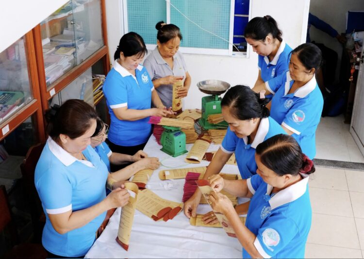 Hội viên phụ nữ phường An Hội, tỉnh Vĩnh Long tham gia chuẩn bị nguyên liệu làm nhang.