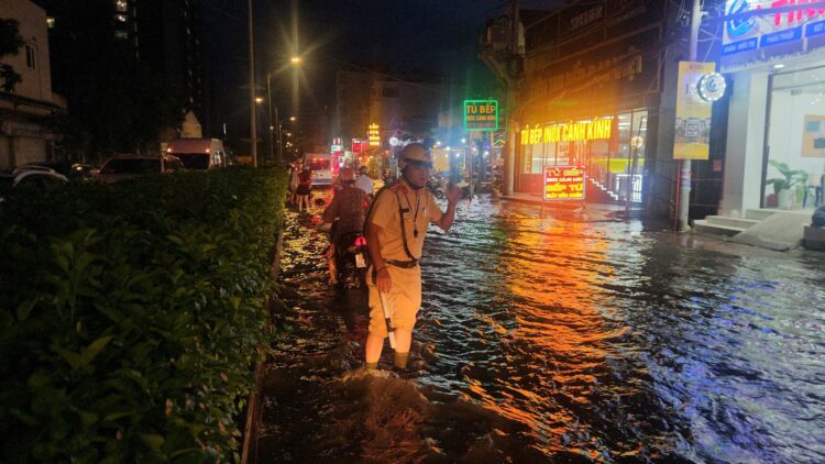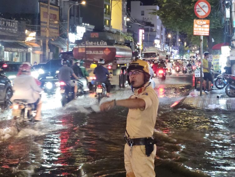 Nước ngập lên tới đầu gối, nhưng các anh vẫn đứng đó, kiên định giữa làn nước chảy xiết. Không một lời than vãn, không một dấu hiệu mệt mỏi, từng cử chỉ ra hiệu, từng động tác hướng dẫn xe đi qua vùng ngập được thực hiện dứt khoát, chuyên nghiệp. Họ – những con người bình dị – đã trở thành điểm tựa an toàn cho hàng trăm người dân trong đêm mưa triều cường.