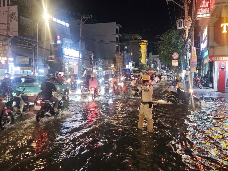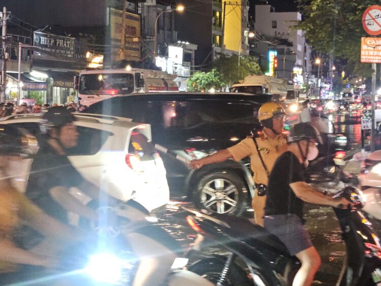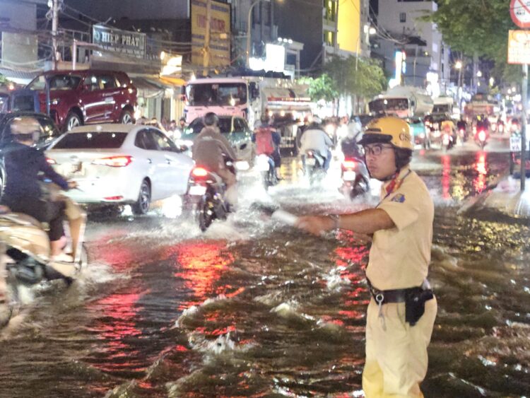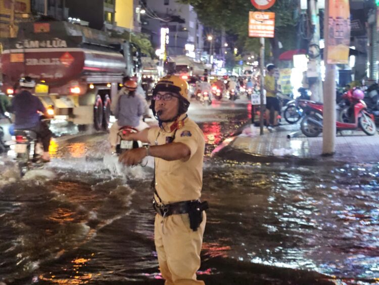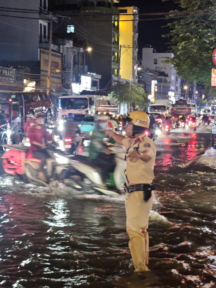 Giữa biển nước, vẫn có những “ngọn đèn vàng” soi lối cho người dân, khi nhiều người dân hối hả trở về nhà sau giờ tan ca, con đường vốn đông đúc bỗng trở thành “dòng sông nhỏ” vì triều cường dâng cao. Ánh đèn xe phản chiếu lên mặt nước lấp loáng, những tiếng pô xe, tiếng máy nổ xen lẫn tiếng nước bắn tung tóe. Giữa khung cảnh hỗn độn đó, hình ảnh những chiến sĩ Trạm Cảnh sát giao thông Đa Phước vẫn lặng lẽ làm nhiệm vụ, điều tiết dòng phương tiện, hỗ trợ người dân vượt qua đoạn ngập khiến ai chứng kiến cũng xúc động.