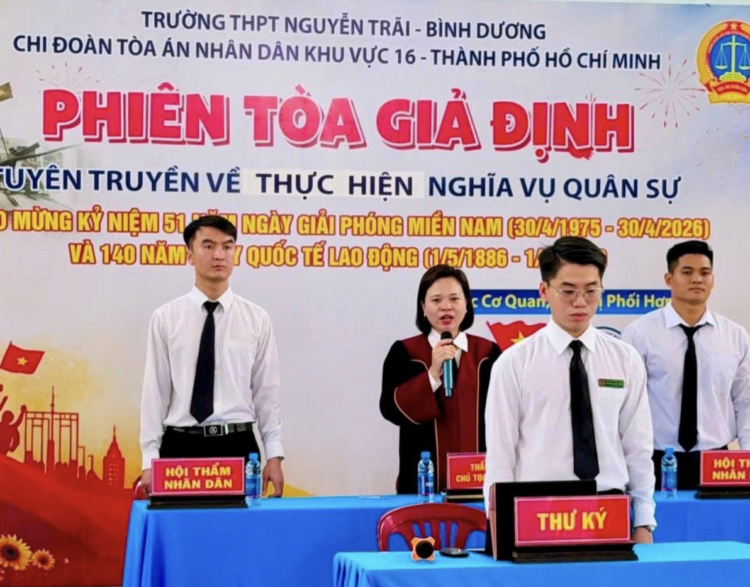 Nhân kỷ niệm 51 năm Ngày Giải phóng miền Nam, thống nhất đất nước (30/4/1975 – 30/4/2026) và 150 năm Ngày Quốc tế Lao động (01/5/1886 – 01/5/2026), Chi đoàn TAND khu vực 16 – TP.HCM phối hợp Trường THPT Nguyễn Trãi tổ chức chương trình tuyên truyền, phổ biến pháp luật về thực hiện nghĩa vụ quân sự, thu hút hơn 600 học sinh tham gia.