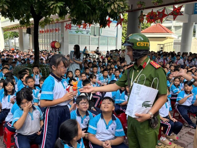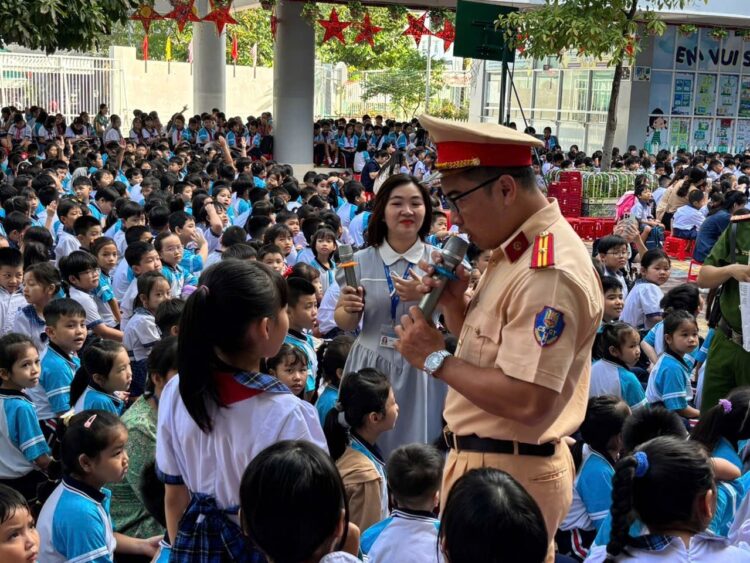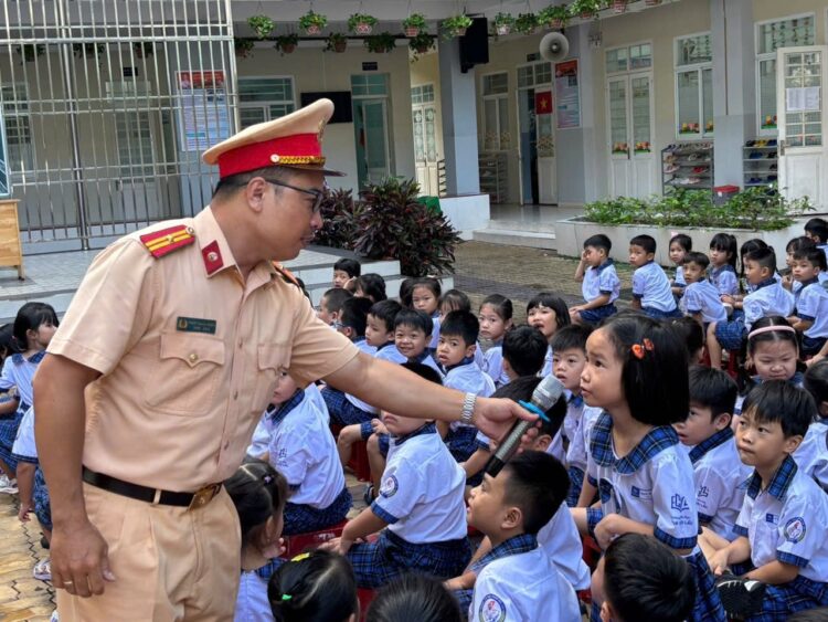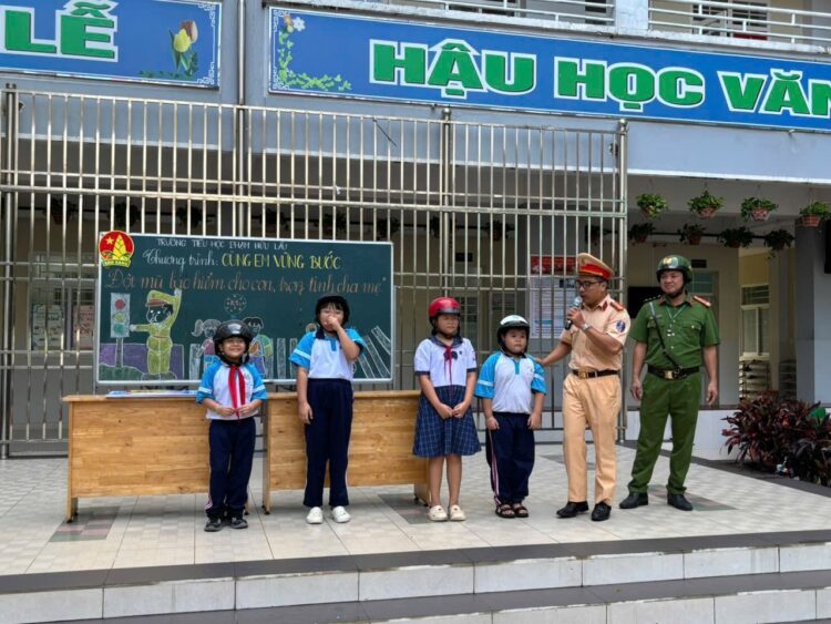 Trạm CSGT Đa Phước phối hợp công an phường Tân Mỹ (sau sáp nhập) tuyên truyền an toàn giao thông học đường tại trường tiểu học Phạm Hữu Lầu